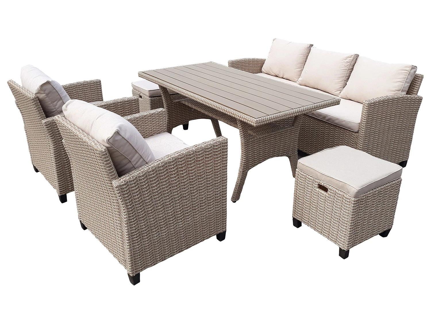 Eine gemütliche Lounge bestehend aus einem 3-Sitzer Sofa, zwei Sesseln, zwei Hockern und einem Tisch. Unter dem Tisch befindet sich eine Ablagefläche und die Tischplatte ist aus Kunststoff. Diese sorgt durch die Holzoptik für einen Blickfang. Die beiden Hocker dienen zum bequemen Beinablegen. Die Rücken- und Sitzkissen bieten einen hohen Komfort. Die Bezüge aller Kissen sind mit einem Reißverschluss versehen und können schnell und leicht abgenommen und bei 30° gewaschen werden. Das Gestell ist auch pulverbeschichtetem Stahl und ist somit besonders stabil.