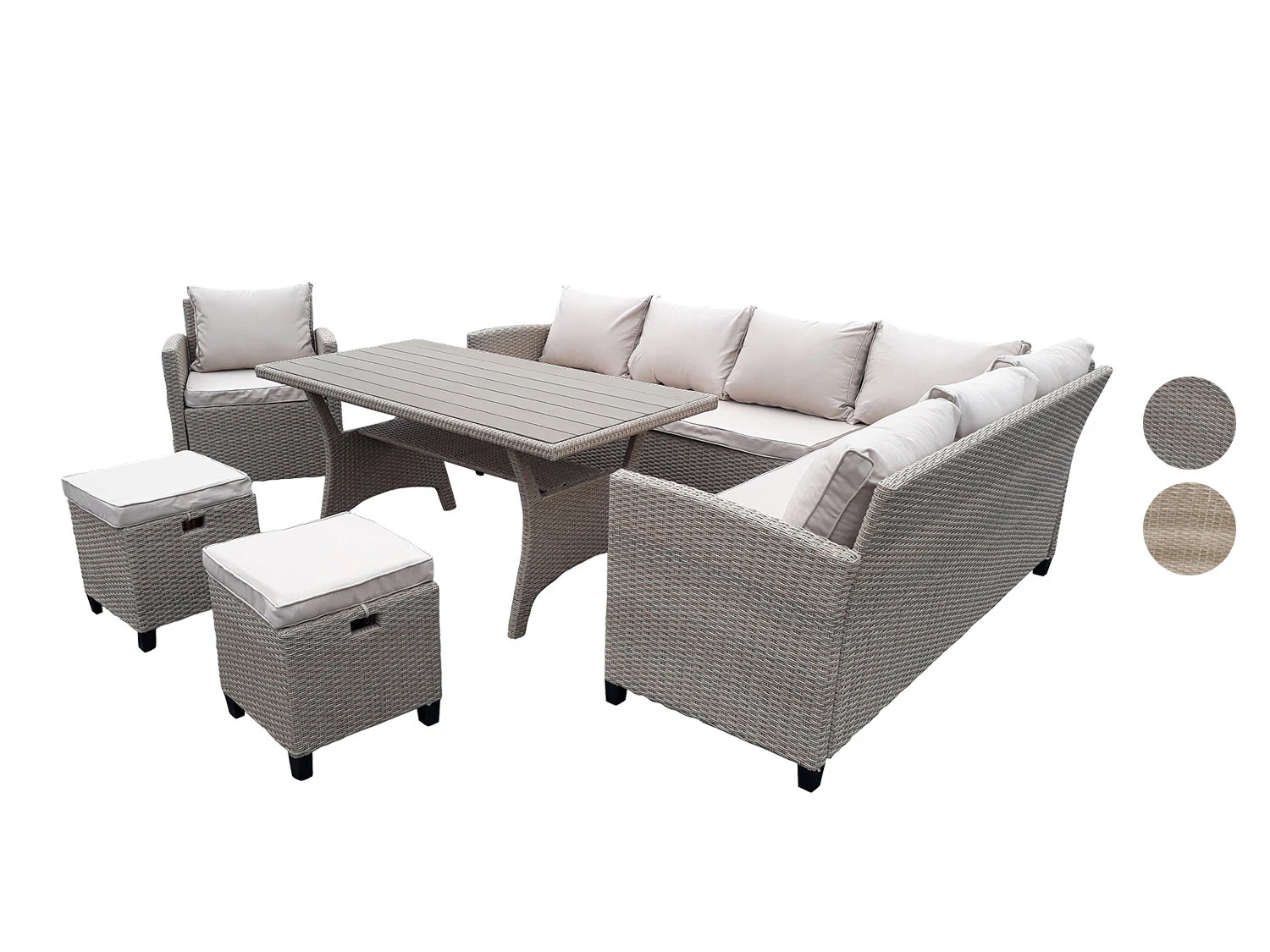 Eine gemütliche Ecklounge bestehend aus zwei Sofas, einem Sessel, zwei Hockern und einem Tisch. Unter dem Tisch befindet sich eine Ablagefläche und die Tischplatte ist aus Kunststoff. Diese sorgt durch die Holzoptik für einen Blickfang. Die beiden Hocker dienen zum bequemen Beinablegen. Die Rücken- und Sitzkissen bieten einen hohen Komfort. Die Bezüge aller Kissen sind mit einem Reißverschluss versehen und können schnell und leicht abgenommen und bei 30° gewaschen werden. Das Gestell ist auch pulverbeschichtetem Stahl und ist somit besonders stabil.