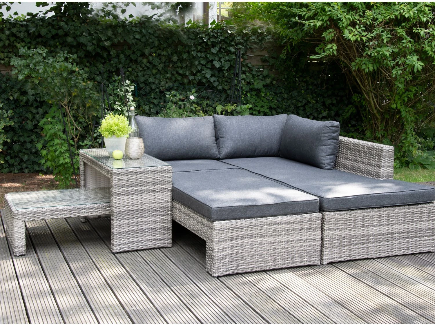 Wie das Wort »multifunktional« schon sagt, ist die „Samoa“ dank der einzelnen Module individuell nutzbar. Bei über 8 verschiedenen Stellmöglichkeiten, ist auch für dich was dabei. Stelle die Lounge so auf, wie du sie gerade benötigst und der Platz es erlaubt. Mit zwei Beistelltischen in unterschiedlichen Größen gibt es genug Abstellmöglichkeit für z.B. dein Getränk, Snack, Buch, etc. Nutze „das Maximum“ mit bis zu 6 Personen oder entspanne alleine oder zu zweit. Eines der Sofas hat noch ein besonderes Highlight, da man die Sitzfläche hochklappen und als Rückenlehne für die Liegeposition nutzen kann. Die extra dicken Sitz- und Rückenkissen bieten einen hohen Komfort. Die Bezüge aller Kissen sind mit einem Reißverschluss versehen und können schnell und leicht abgenommen und bei 30° gewaschen werden.