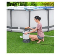 Der Traum vom preiswerten Frame Pool wird endlich wahr, denn mit dem Steel Pro™ Aufstellpool von Bestway® holst du dir ausgelassenen Badespaß direkt nach Hause. Ganz ohne Schnickschnack kann der korrosionsbeständige Stahlrahmen mit Antihaftbeschichtung dieses Swimmingpools (366 x 84 cm) durch stabile T-Verbinder im Handumdrehen aufgebaut werden, danach heißt es: Wasser marsch! Ganze 7.480 Liter passen in diese himmelblaue, runde Wellnessoase – ein Highlight für die ganze Familie. Die 3-lagige Poolfolie aus hochwertigem DuraPlus™ -Material ist nicht nur robust, sondern macht den Steel Pro™ besonders langlebig. Damit das Wasser lange kristallklar bleibt, kommt die Flowclear™ Filterpumpe (3.028 l/h) & mit passender Kartusche zum Einsatz, um den Inhalt des Swimmingpools effektiv & optimal zu reinigen. Für grobe Verschmutzungen wie Laub etc. wird die Pumpe vom ebenfalls im Lieferumfang enthaltenen Oberflächenskimmer unterstützt. Mit dem schwimmenden Poolthermometer können Sie die Wassertemperatur stets mühelos kontrollieren. Der selbstklebende Reparaturflicken hilft zusätzlich, direkt kleine Schäden am Pool auszubessern. Nach der Badesaison kann das Wasser ganz leicht aus dem Inneren abgelassen werden: Das eingebaute Ablassventil mit Gartenschlauchadapter steht Ihnen zur Seite. Im Nu ist der Steel Pro™ Aufstellpool leer & kann eingelagert werden. Ersatzteile? Kein Problem, bei der riesigen Auswahl ist sicherlich das Richtige für den Bedarf dabei. Dieser Frame Pool von Bestway® ist zudem mit zwei Jahren Herstellergarantie abgesichert. Mach dir diesen Sommer zur schönsten Zeit des Jahres!