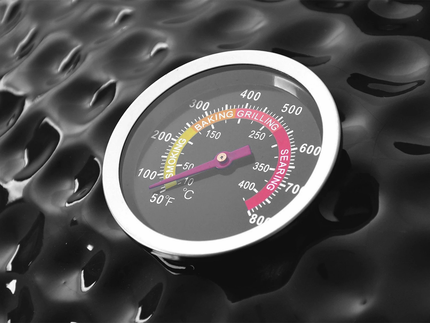- Enthaltenes Zubehör: 1 Edelstahl-Grillrost (Ø 47 cm), 1 erhöhtes Edelstahl-Grillrost, 1 Pizzastein (Ø 36 cm) aus Keramik, 1 Hitzereflektor, 1 Ascheentferner, 1 Grillrostheber, 1 Wetterschutzhülle