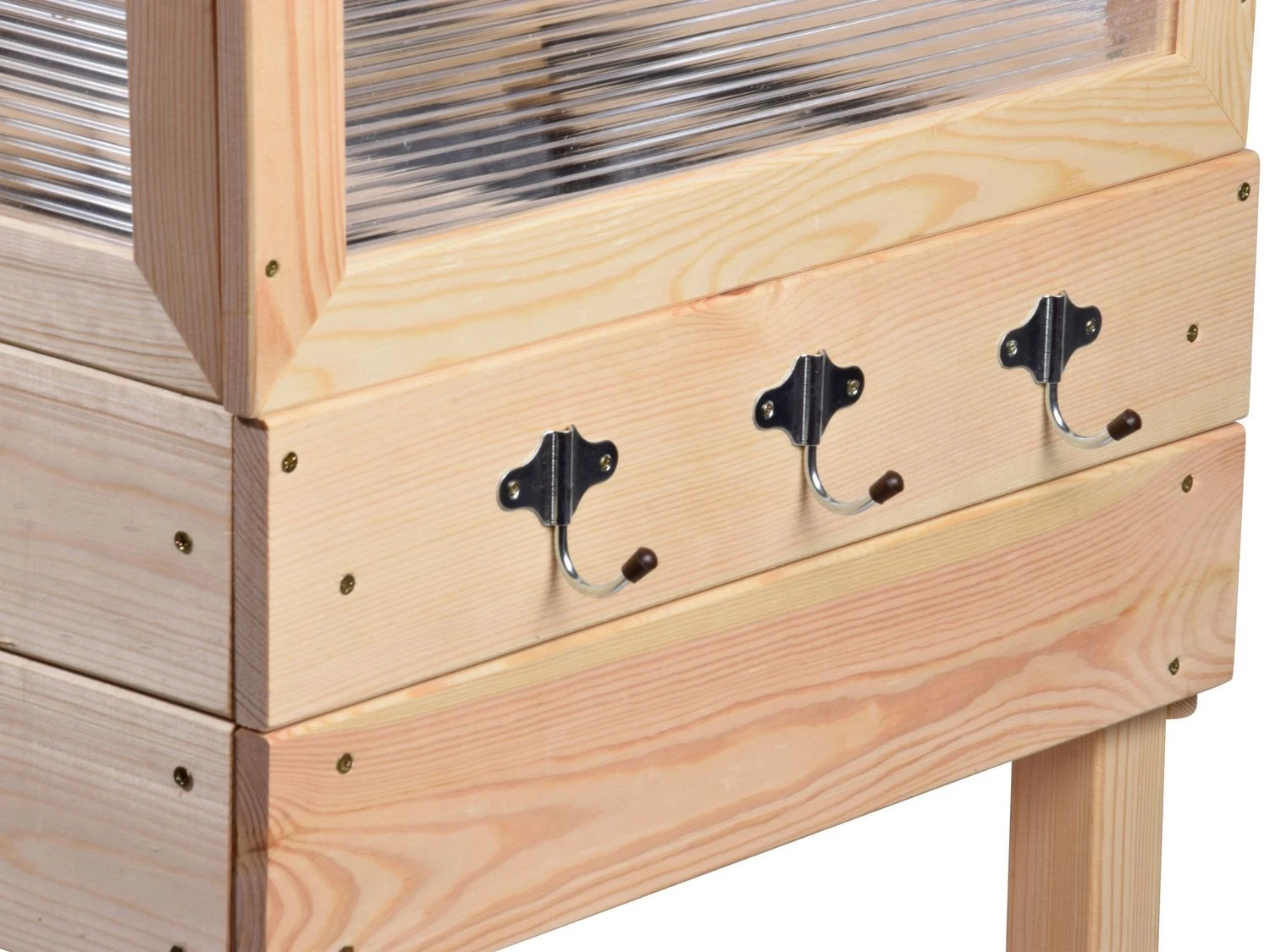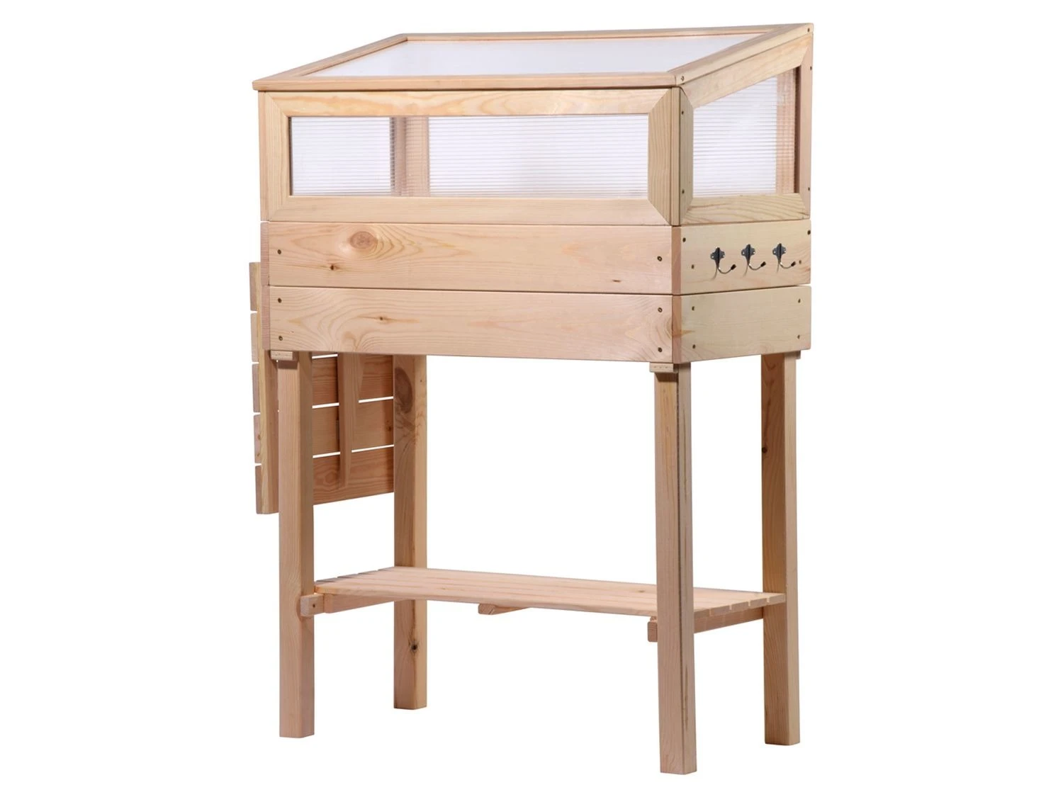 Ein ausklappbarer Tisch an der Seite und eine große Ablagefläche unter dem Beet bieten Ihnen viel Stauraum. An der Seite des Blumenkastens befindet sich ebenfalls eine Hakenleiste für Gartenwerkzeuge – so haben Sie Ihre Gartengeräte immer griffbereit.