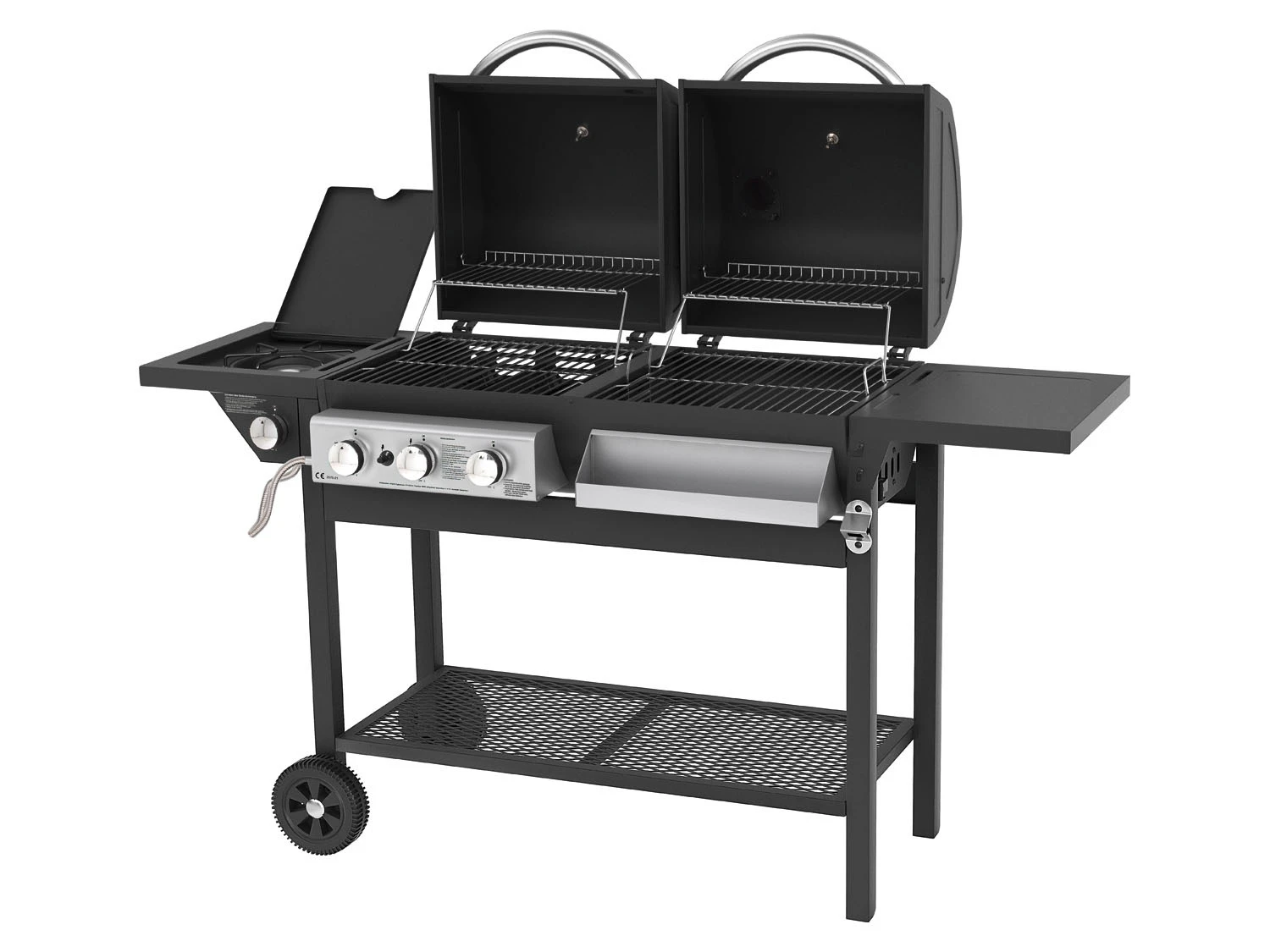- Kombigrill aus Gasgrill mit 3 Hauptbrennern je 2,05 kW + 1 Seitenbrenner 3,2 kW und Holzkohlegrill