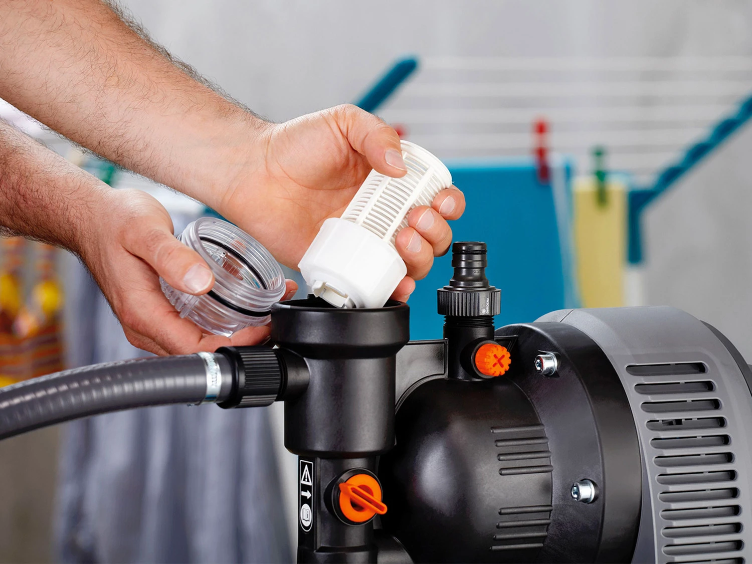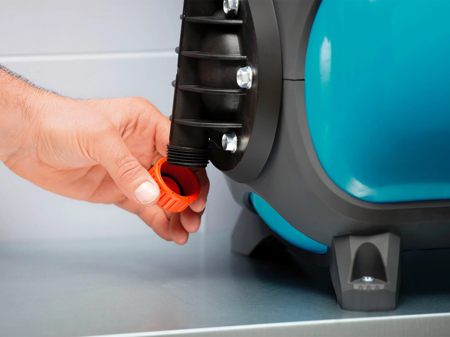Die automatische Sicherheitsabschaltung als Überhitzungsschutz bewahrt die Pumpe bei fehlendem Wassernachschub vor dem Heißlaufen. Sie ist mit einem großvolumigen Tank (24 l) ausgestattet, der für 5 Jahre wartungsfrei ist, sodass in dieser Zeit weder die Membran ausgetauscht noch Luft nachgefüllt werden muss wie sonst bei Hauswasserwerken üblich. Das Hauswasserwerk verfügt serienmäßig über einen integrierten Vorfilter, der die automatische Pumpe vor Schmutz und Sand schützt, sowie einen Rückflussstopp. Die große Einfüllöffnung und das Entlüftungsventil unterstützen die problemlose Inbetriebnahme und die Selbstansaugung ist durch die manuelle Rückschlagventil-Einstellung optimiert. Zusätzlich wacht ein Thermoschutzschalter über den durchgehend störungsfreien Betrieb des wartungsfreien Kondensatormotors. Bei Frostgefahr wird die Druckpumpe mit Hilfe der Wasser-Ablassschraube entleert.