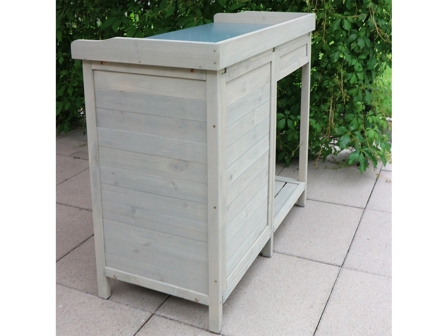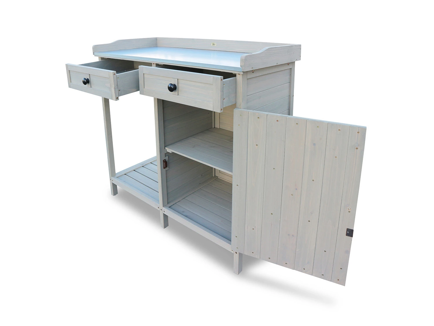 Auf der Arbeitsplatte aus Metall können Pflanzen umgetopft oder Grillgut abgelegt werden, während Werkzeuge und Zubehör direkt darunter in den beiden Schubladen, in dem kleinen Gartenschrank oder auf der Ablagefläche bereit liegen. Die Arbeitsfläche ist mit Holzleisten umrahmt, sodass nichts herunterfallen kann. Zudem ist das Blech vollständig umkantet – keine Ecken oder Spitzen können hervorstehen.