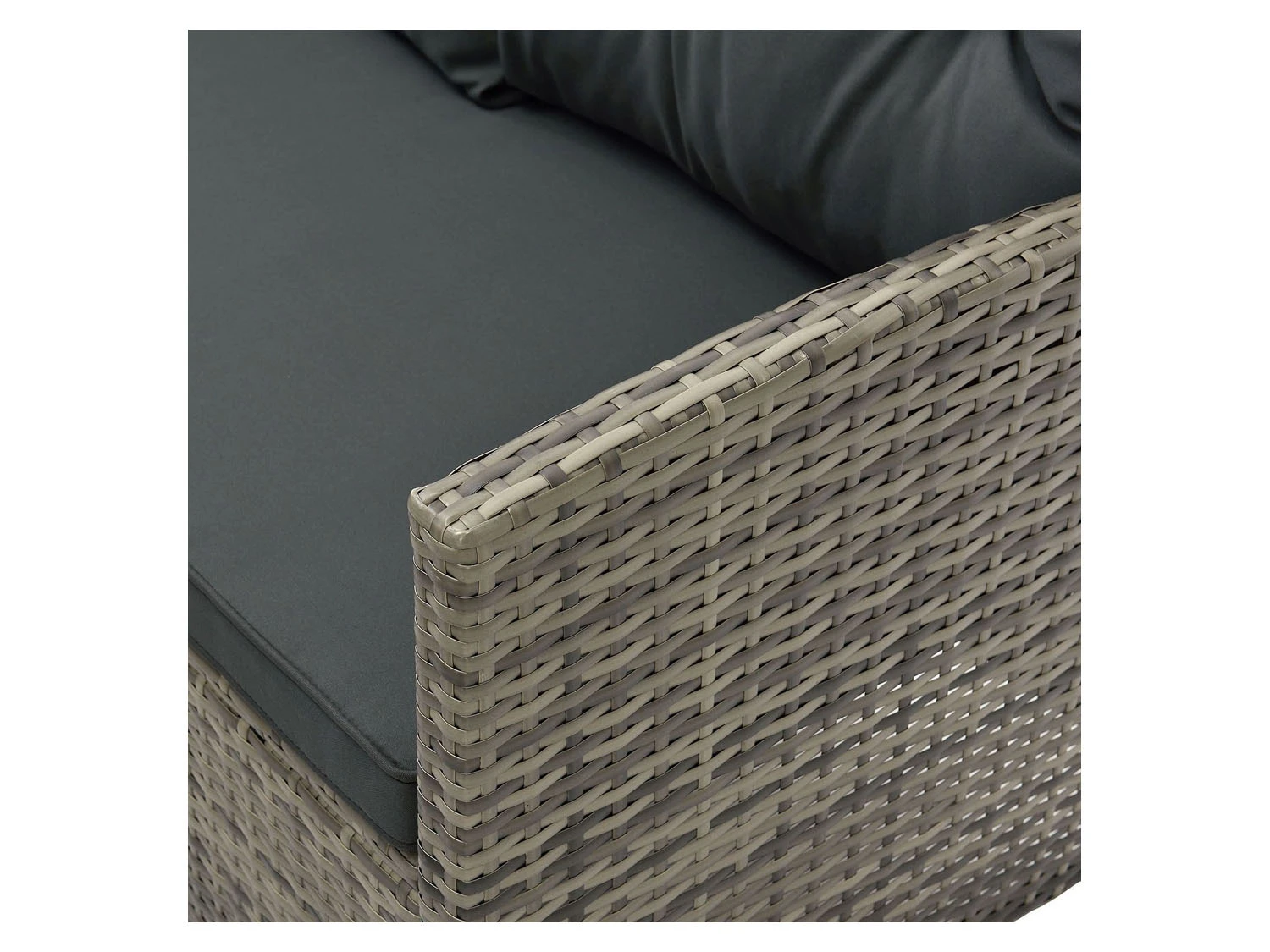 Mit dem Polyrattan Lounge Set Manacor verwandelst du Garten, Terrasse oder Balkon in einen stilvollen Ort zum Entspannen und Wohlfühlen. Die große Gartenlounge mit Sofa, 2 Hocker und Tisch bietet bis zu 7 Personen Platz. Weiche Sitz- und Rückenkissen sorgen für ein gemütliches Sitzgefühl. Zum Speisen oder für Gesellschaftsspiele steht Ihnen der große Esstisch zur Verfügung. Gesellige Abende mit Familie, Freunden oder Nachbarn werden so zu einem tollen Erlebnis unter freiem Himmel. Die einzigartige Rattan-Optik verleiht dem Gartenmöbel-Set einen modernen Charme.