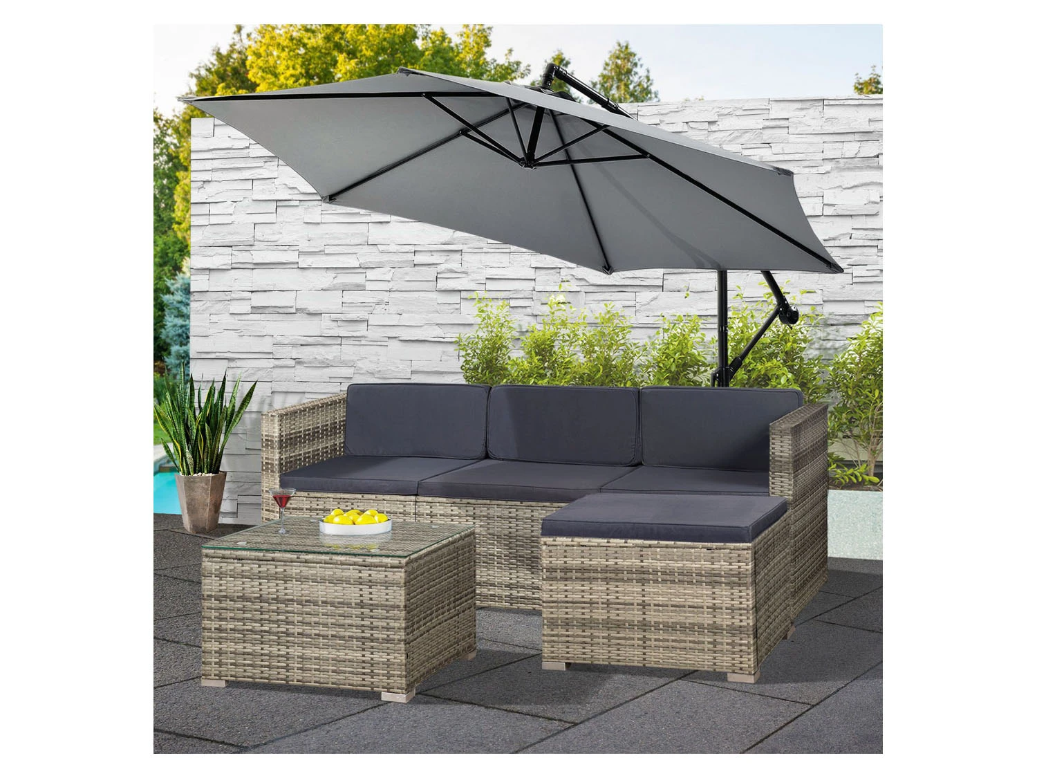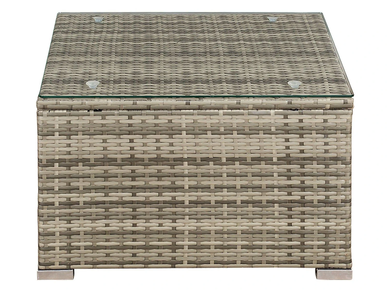 Inklusive ist ein 61 cm breiter und 37 cm hoher Tisch. Dieser bietet genügend Platz für Snacks oder kühle Getränke. Die zugehörige Glasplatte ergänzt sich perfekt mit der geflochtenen Rattan-Optik und lässt sich leicht abwischen. So bist du startklar für den Sommer!
