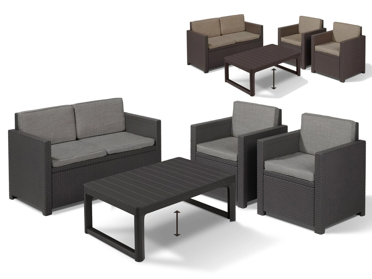 - Das moderne Gartenmöbel Lounge Set besteht aus zwei Stühlen, einem 2-Sitzer-Sofa und einem höhenverstellbarem Tisch