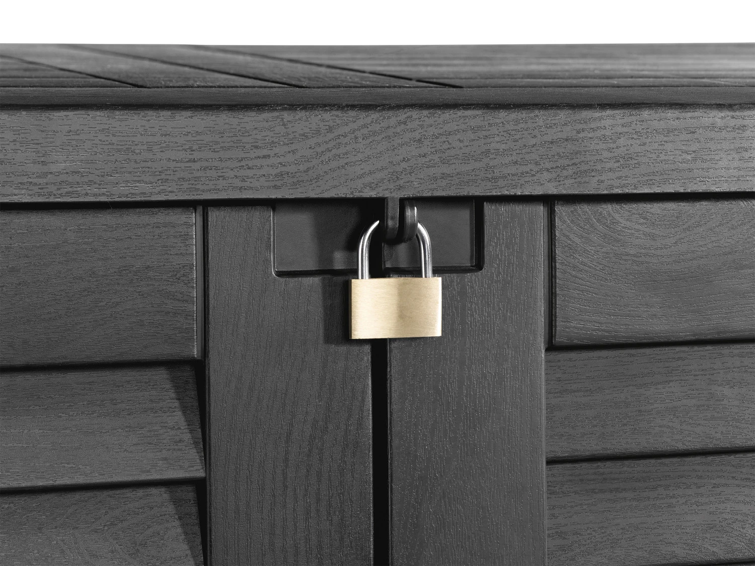 - Mit Fußriegel und Vorhängeschlossvorrichtung (Schloss nicht enthalten)