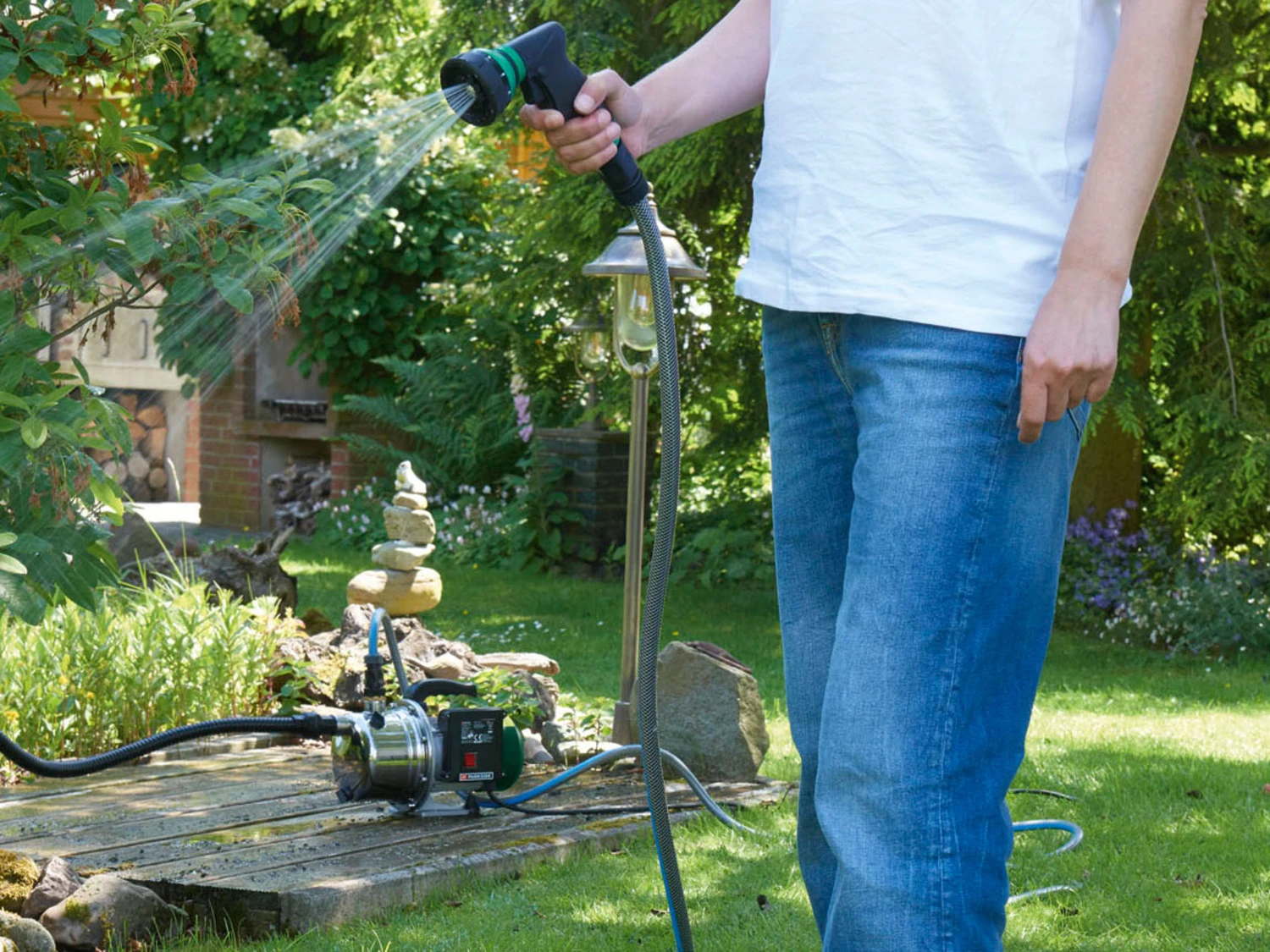 - Leistungsstarke Gartenpumpe inkl. 4 m Saugschlauch mit Filterkorb und Rückfluss-Stopp