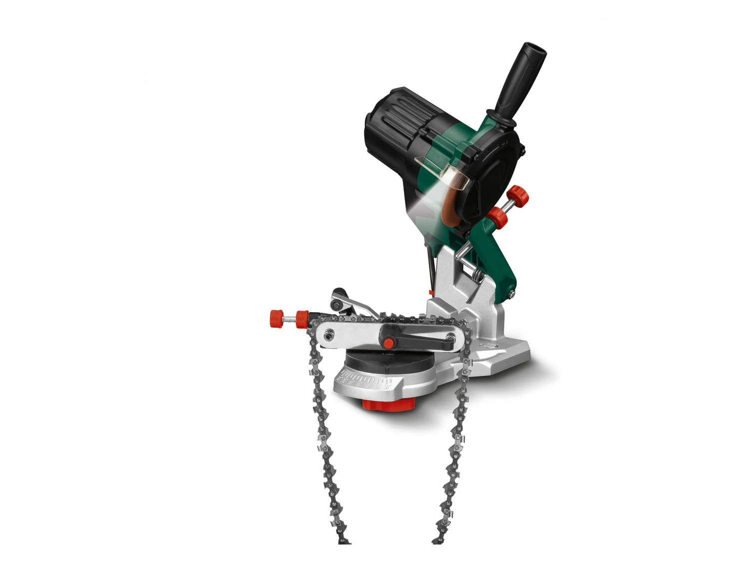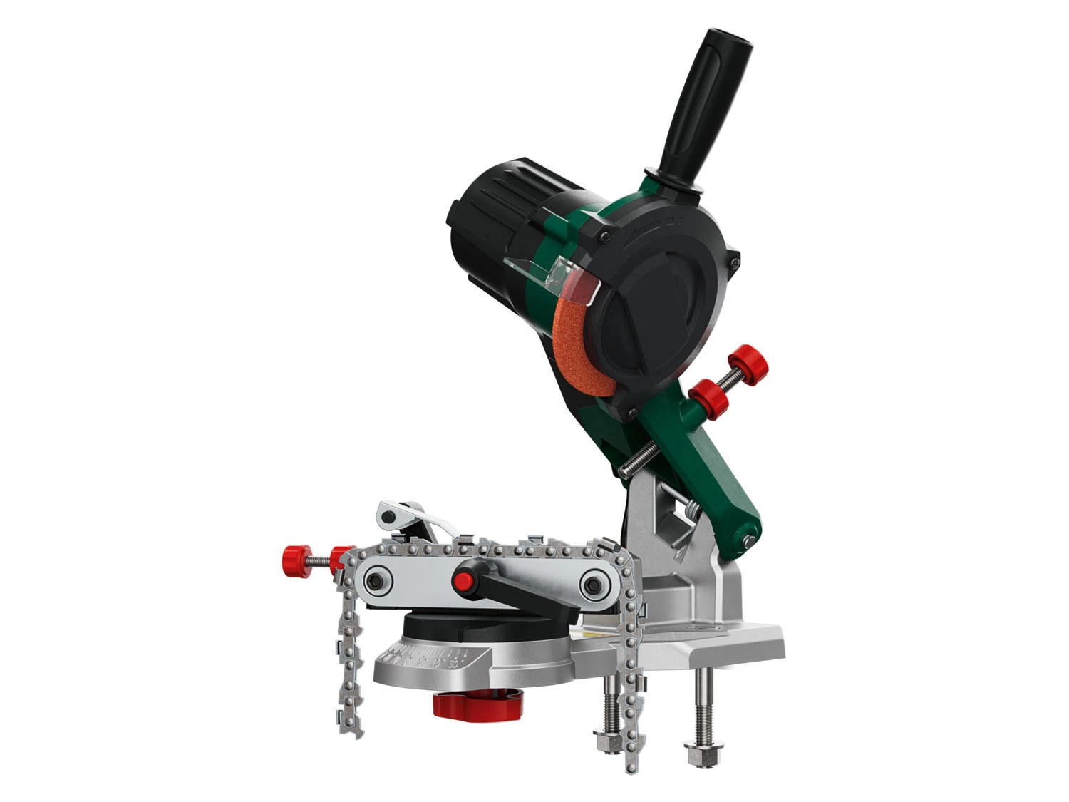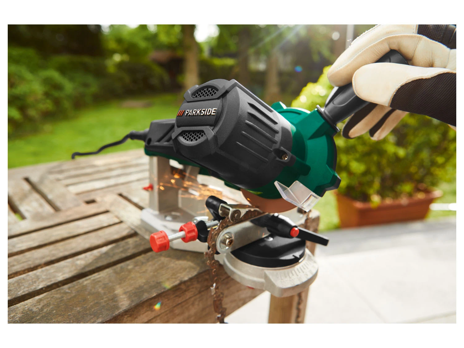- Komfortables und präzises Schärfen ohne Umspannen der Sägekette