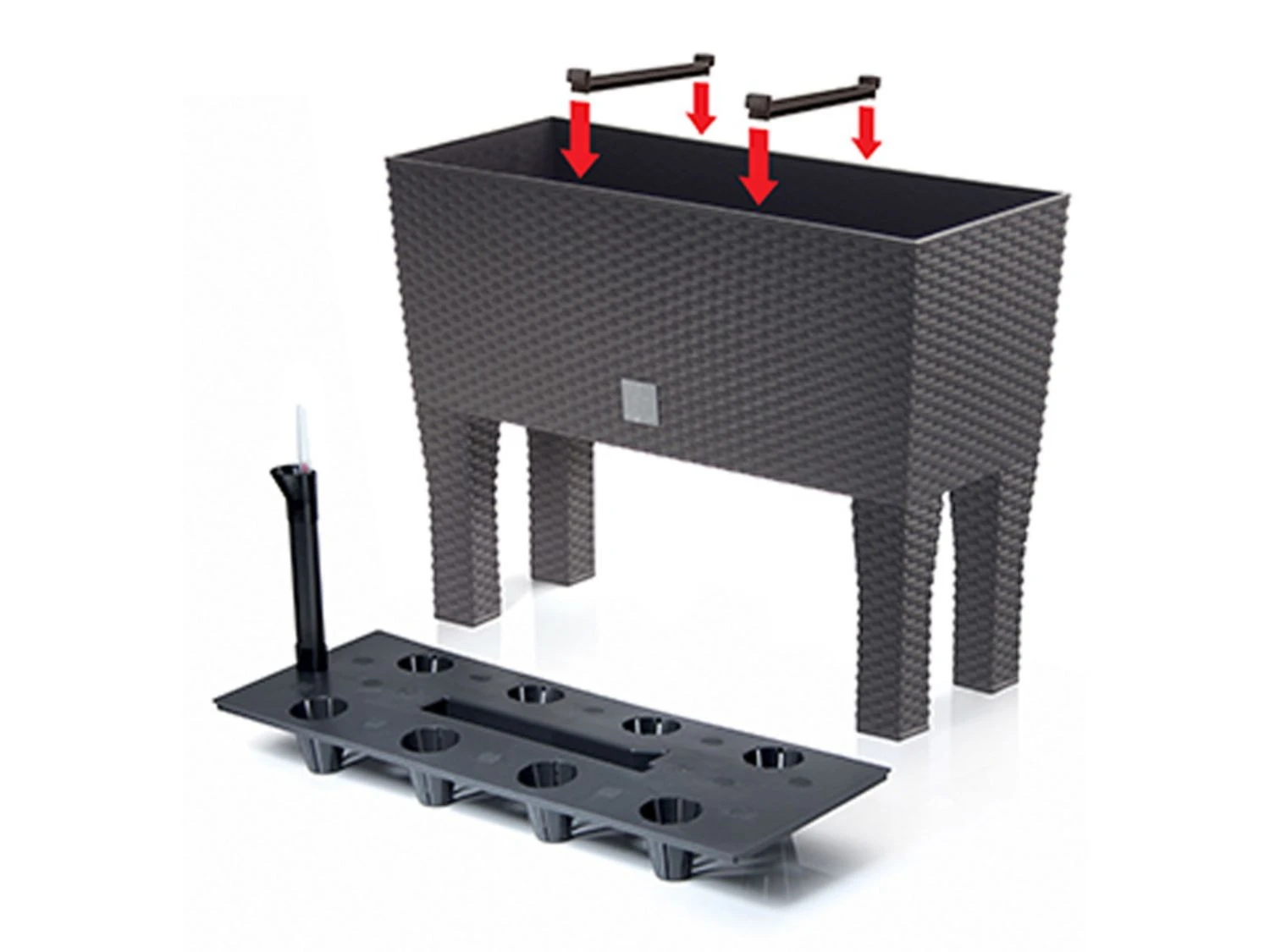 Der Blumenkübel eignet sich nicht nur zur Pflanzenzucht, sondern auch das ganze Jahr über für Ihre Pflanzen. Mit dem durchdachten Bewässerungssystem ziehen sich die Pflanzen immer soviel Wasser, wie sie gerade benötigen. Auch im Hochsommer oder wenn Sie einmal im Urlaub sind, sind Ihre Blumen durch das vorhandene Wasserresservoir bestens vor einem Austrocknen geschützt. Der Bewässerungseinsatz wird am Boden des Blumenkasten eingesetzt, so bekommen Ihre Pflanzen nie nasse Füße und sind dennoch optimal mit Wasser versorgt. Über den integrierten Wasserstandsanzeiger lässt sich zudem der Wasserstand direkt ablesen.