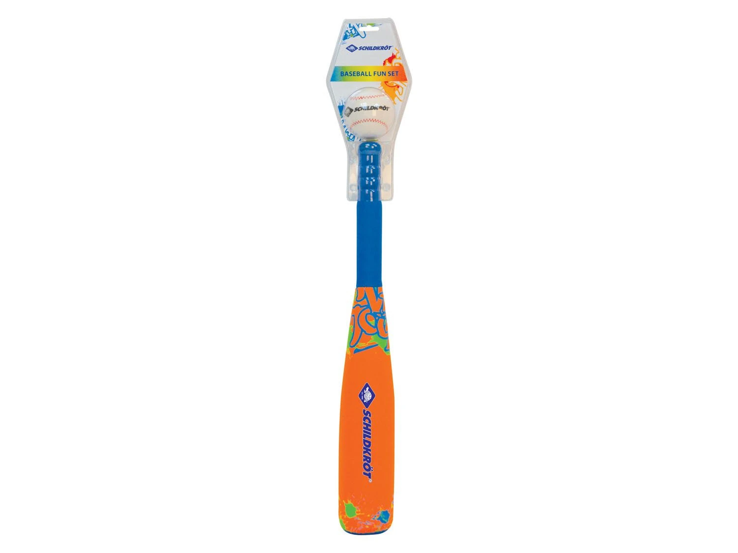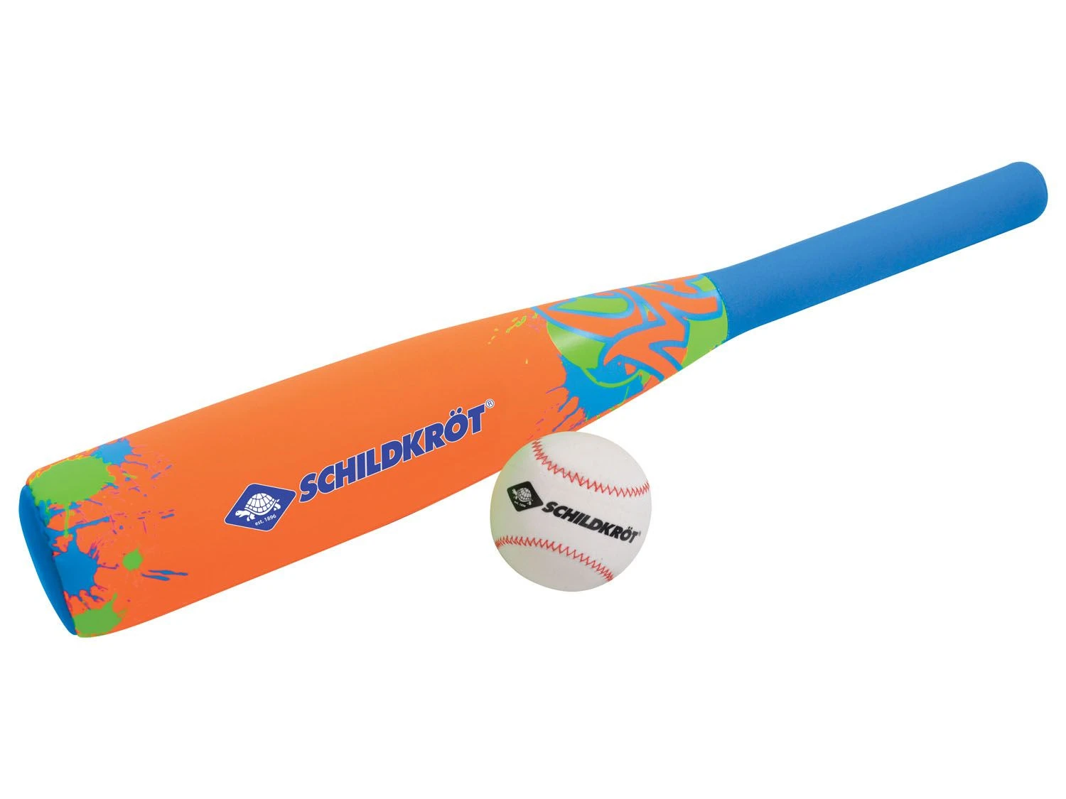 Weicher Baseballschläger aus dem Hause Schildkröt (62 cm, 200 g), im Kern ist ein dünnes Kunststoffrohr, das mit Schaumstoff ummantelt und dann mit griffigem Neopren überzogen ist. So können schon die jüngeren ungefährlich an diesen coolen Sport herangeführt werden. Das Set ist salzwasserfest und somit auch ein beliebter Begleiter für Strand und Meer. Das griffige, textile Neopren liegt super und sicher in der Hand. Durch die oben beschriebene weiche Konstruktion ist das Set weitgehend ungefährlich. Bitte haben sie trotzdem ein Auge auf Ihre Kinder beim Spiel. Bitte nicht mit dem Schläger zuschlagen. Die über 100 Jahre alte deutsche Marke Schildkröt gilt als Erfinder des Tischtennisballs. Heute bietet Schildkröt neben Tischtennis auch eine sehr umfangreiche Funsport-Kollektion an und gilt als Marktführer in diesem Bereich.