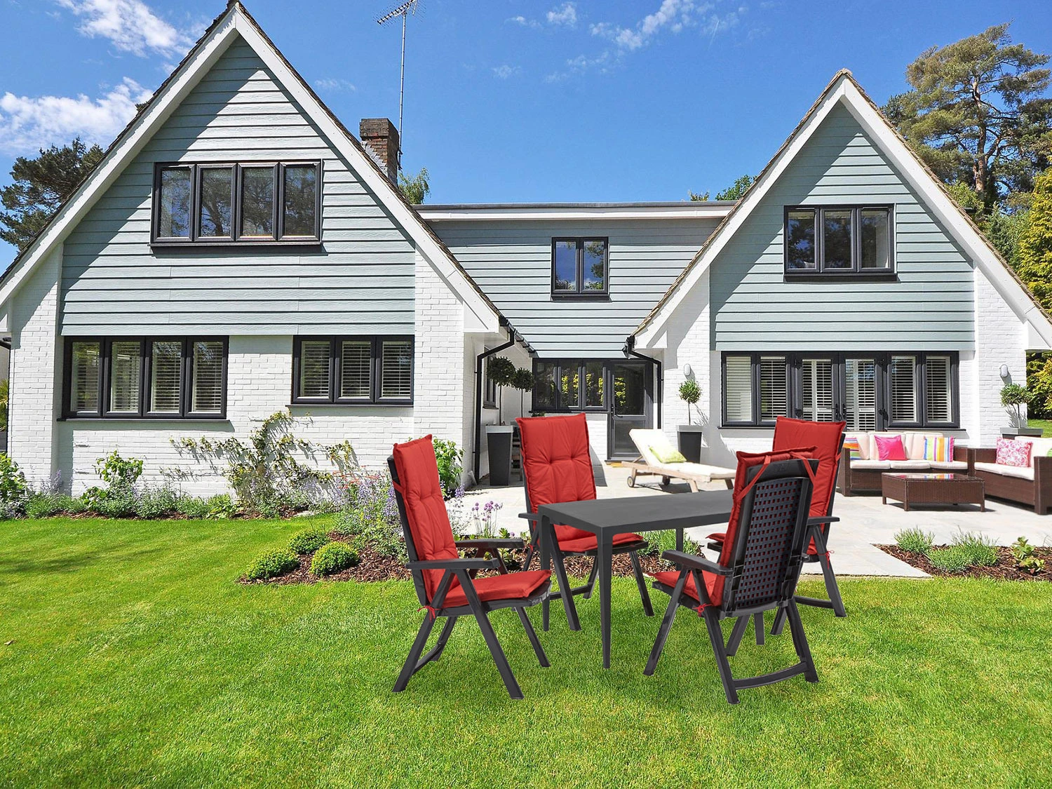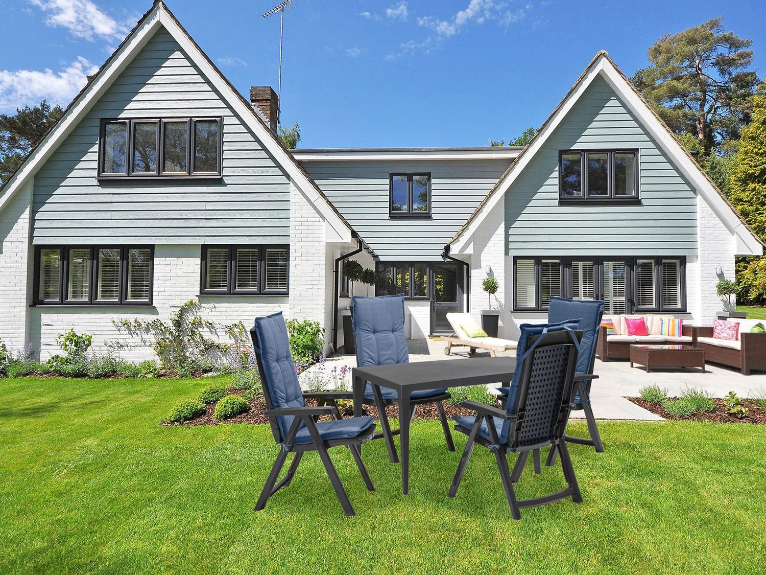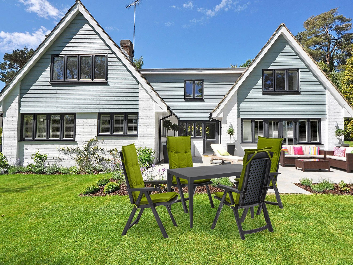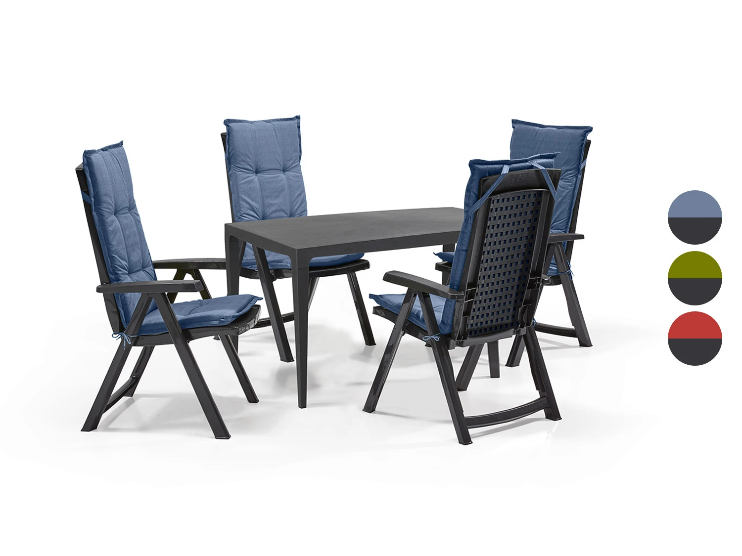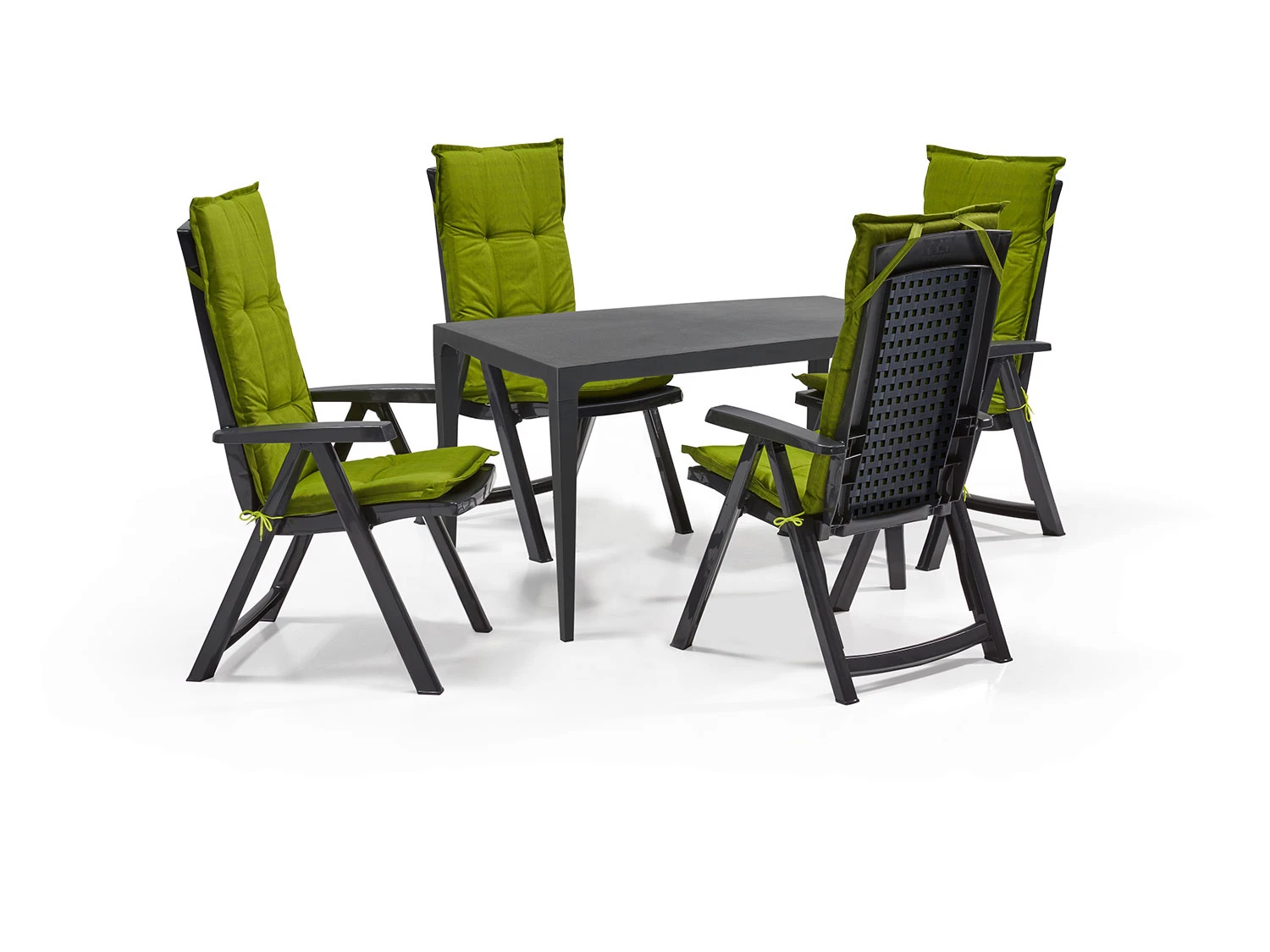 Das Milano Diningset der Marke Shaf punktet durch sein schlichtes Design und den gemütlichen Sitzkomfort. Breite Stühle mit tiefen Sitzflächen ermöglichen einen bequemen Aufenthalt. Das Gartenmöbelset Milano eignet sich perfekt für ein BBQ mit der Familie oder den Freunden an einem heißen Sommertag. Sitzauflagen sind natürlich im Lieferumfang enthalten. Durch die Herstellung aus UV- und witterungsbeständigem Kunststoff, können die Möbel auch auf der Terrasse überwintern. Durch zusammenklappen der Stühle kann das Diningset schnell platzsparend verstaut werden