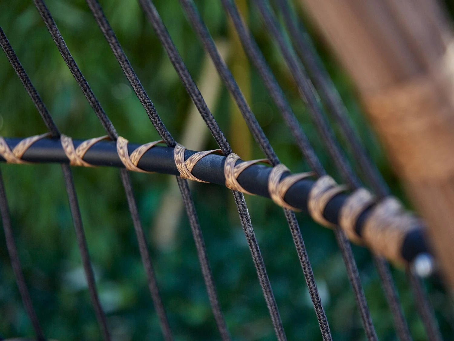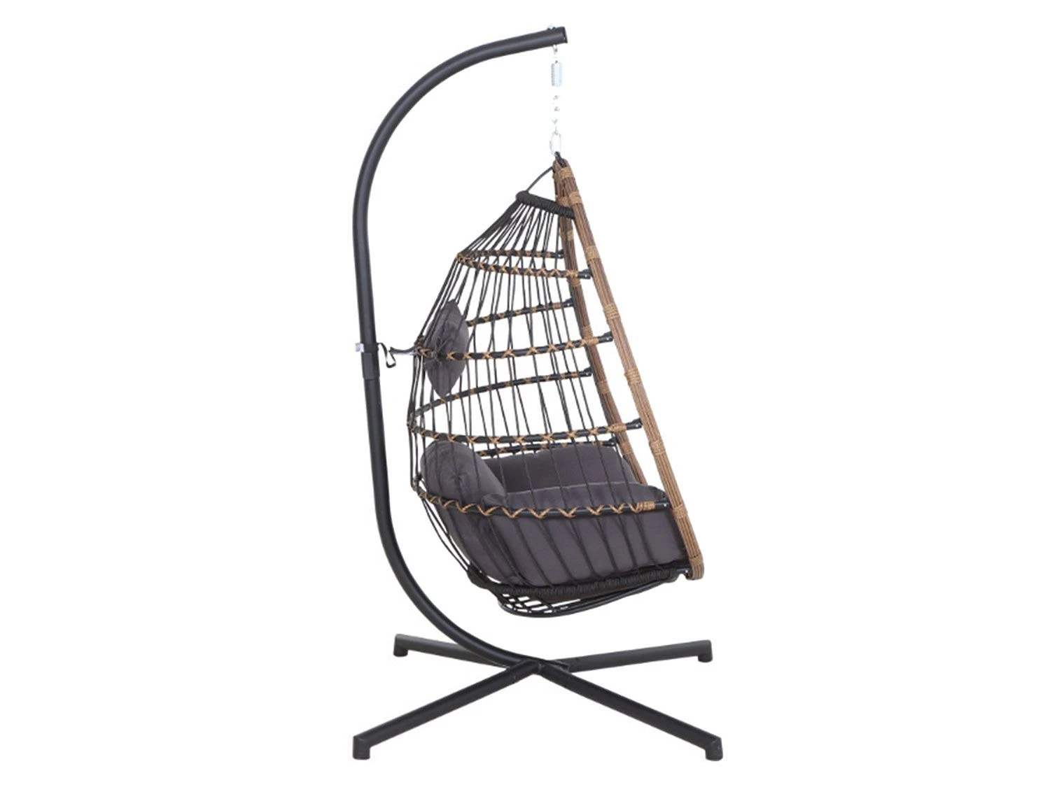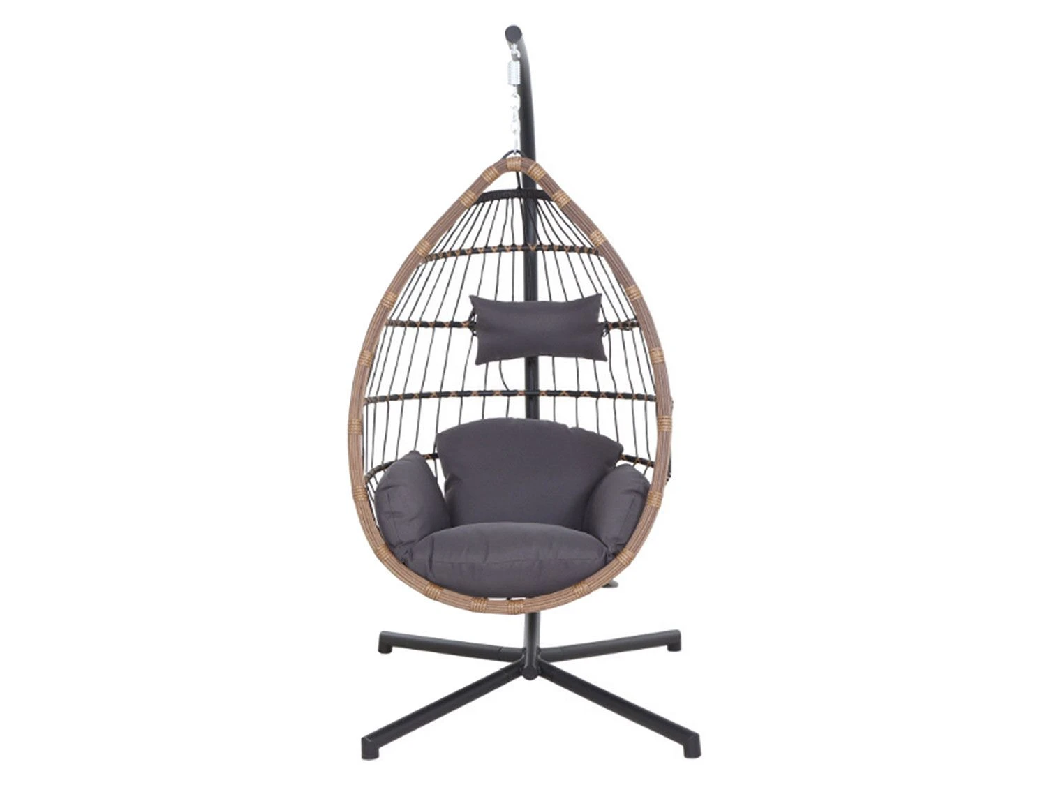 Der Salerno Hängekorb ist aus einem stabilem Stahlgestell gefertigt und in modernem matt anthrazit pulverbeschichtet. Die Kombination aus anthraziten Rope Fasern und flachem und rundem Kunststoffgeflecht in royal oak lässt ihn vielfältig und modern erscheinen. Durch die Kombination der unterschiedlichen Materialien, lässt sich der Hängekorb platzsparend zusammenfalten und verstauen. Bequeme Sitzkissen sowie ein abnehmbares komfortables Kopfkissen garantieren besten Sitzkomfort und laden zum lesen oder entspannen ein. Stabile Kunststofffüße an der Unterseite der 4 Standbeine ermöglichen den Einsatz auf nahezu jedem Untergrund. Eine Sicherheitsleine am hinteren Teil des Korbes die mit dem Gestell verbunden werden muss, verhindert ein zu weites Schwingen und schützt den Nutzer vor der Gefahr des Umkippens.