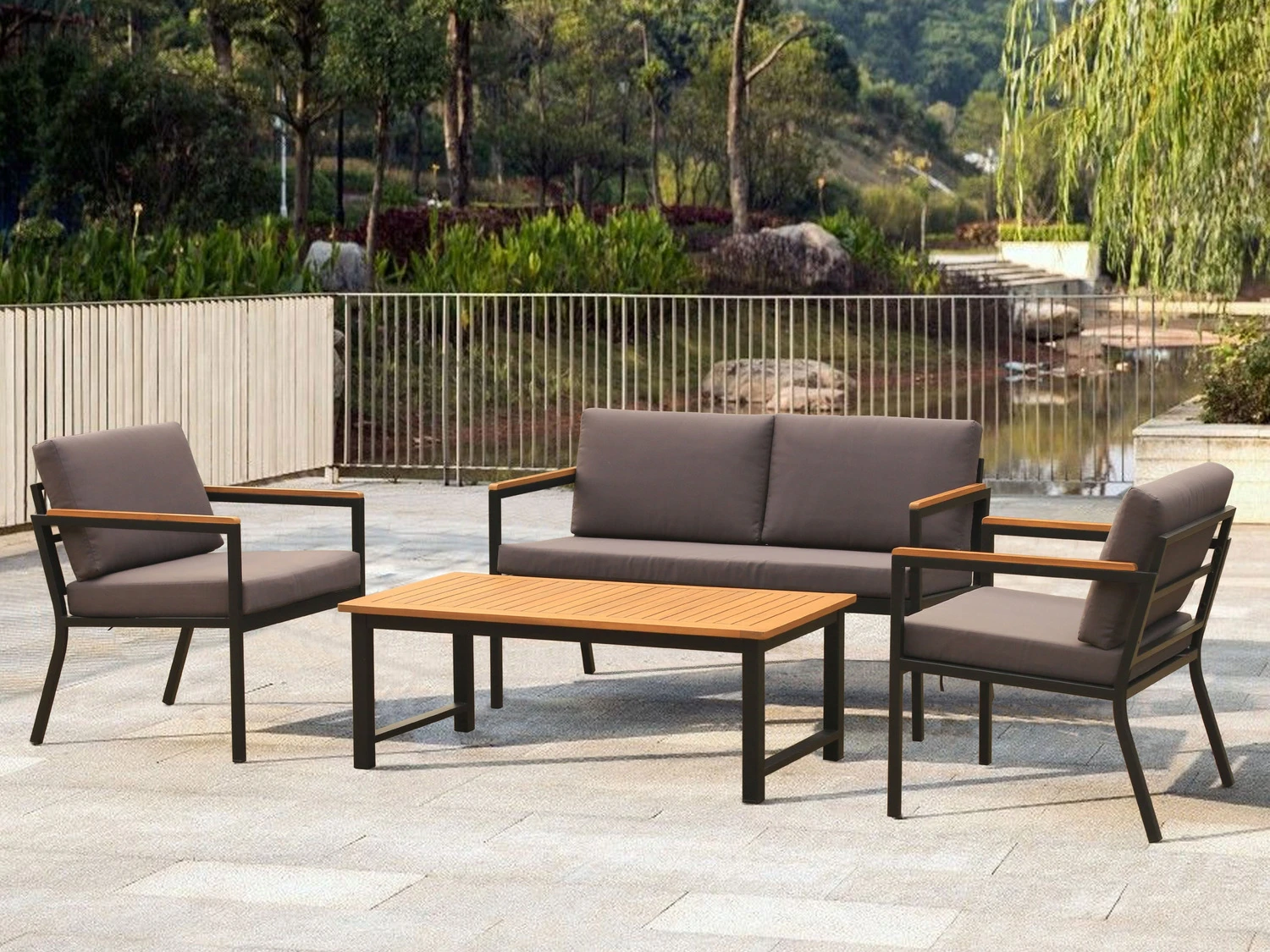 Das schlicht und zeitlos designte Möbelset «Chill» lädt zum Entspannen ein, egal ob auf der Terrasse, im Wintergarten oder im Innenraum. Trotz der Verwendung von langlebigem, robusten und pflegeleichten pulverbeschichtetem Stahl sind die einzelnen Komponenten durch ihr geringes Gewicht jederzeit leicht neu zu Platzieren. Die Armlehnen sowie die Tischplatte sind aus hochwertigem, nachhaltig angebautem Akazien Holz. Abgerundet wird das Set durch die extradicken im Lieferumfang enthaltenen Sitz- und Rückenkissen.