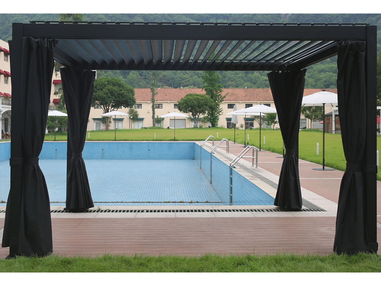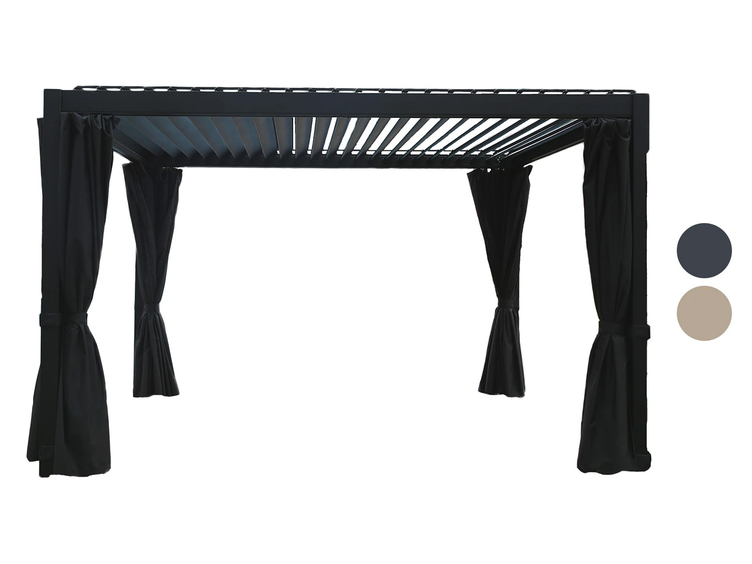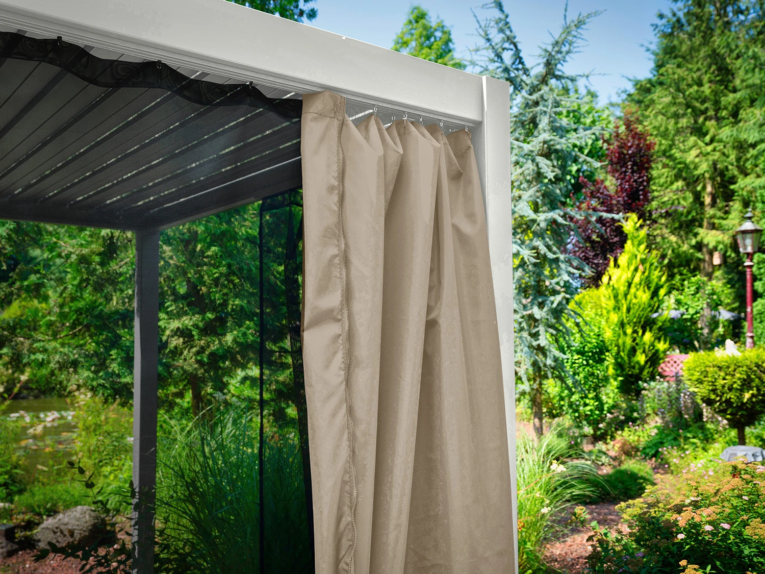- Die Vorhangschienen werden im Rahmen des Aluminium Lamellendachs angebracht und sind somit vollständig im Pavillon integriert