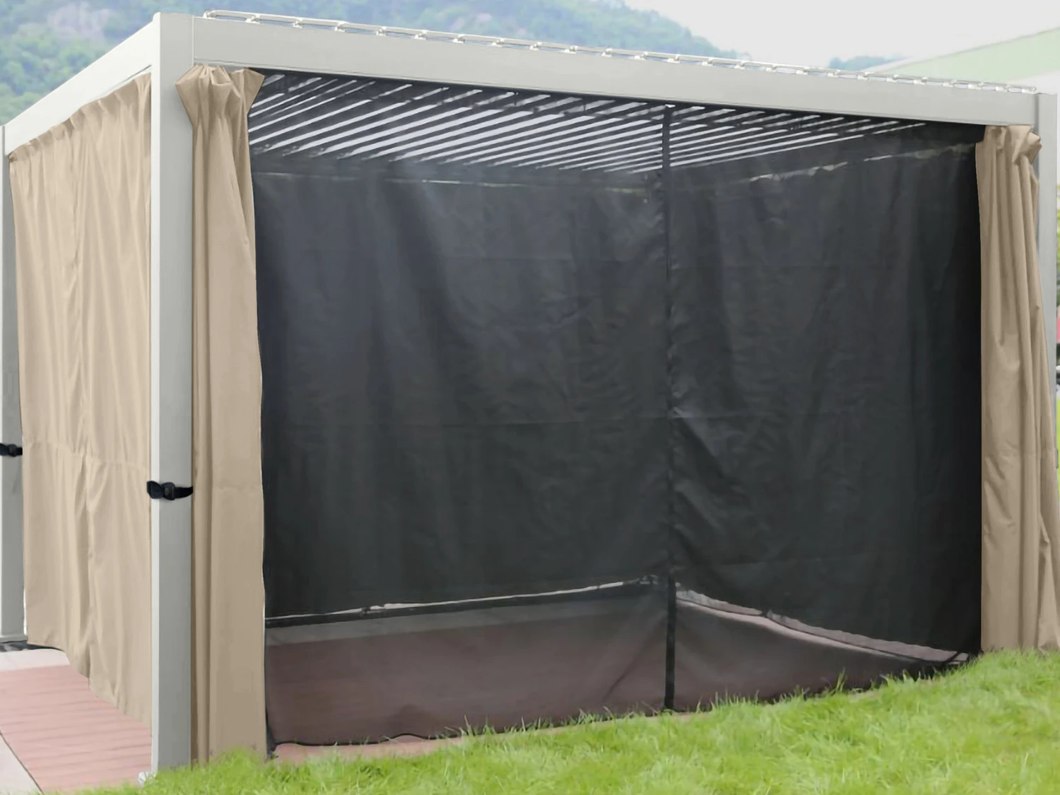 - Die Vorhänge werden mittels Vorhanghacken innen am Pavillon befestigt