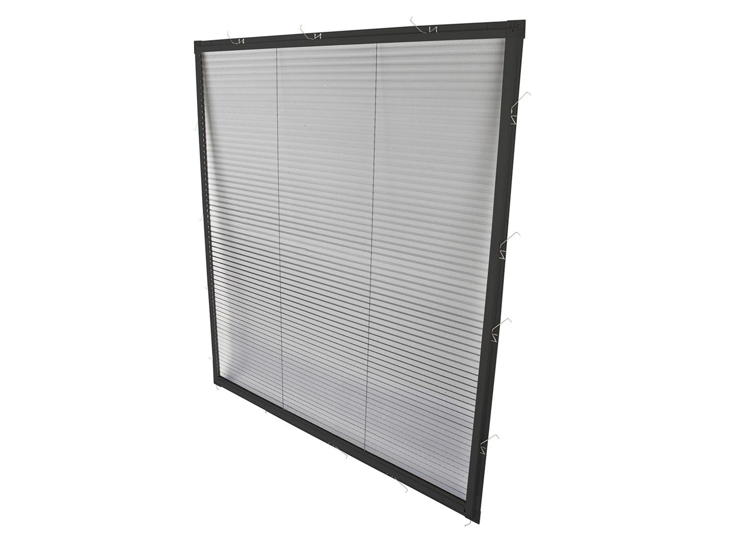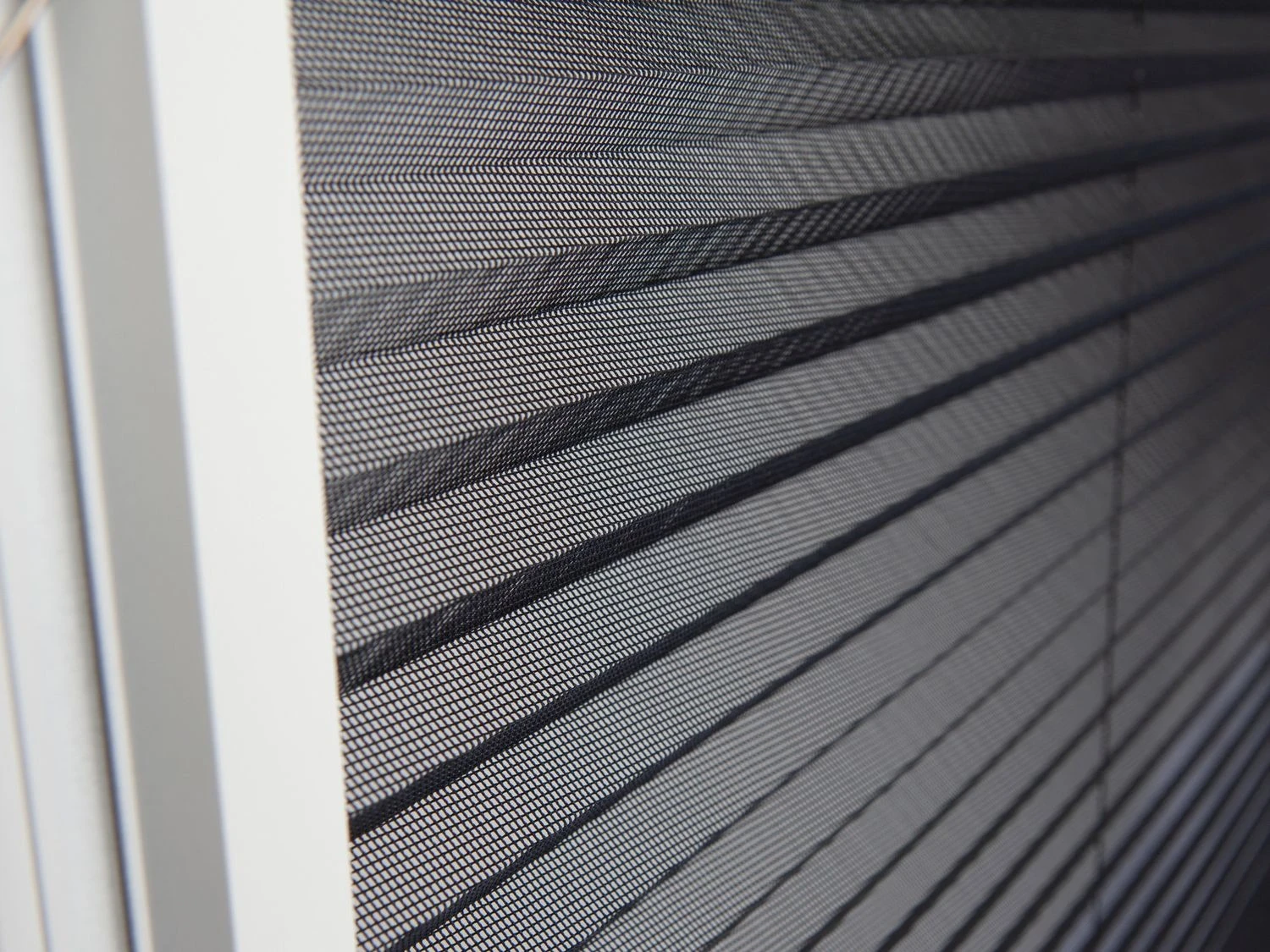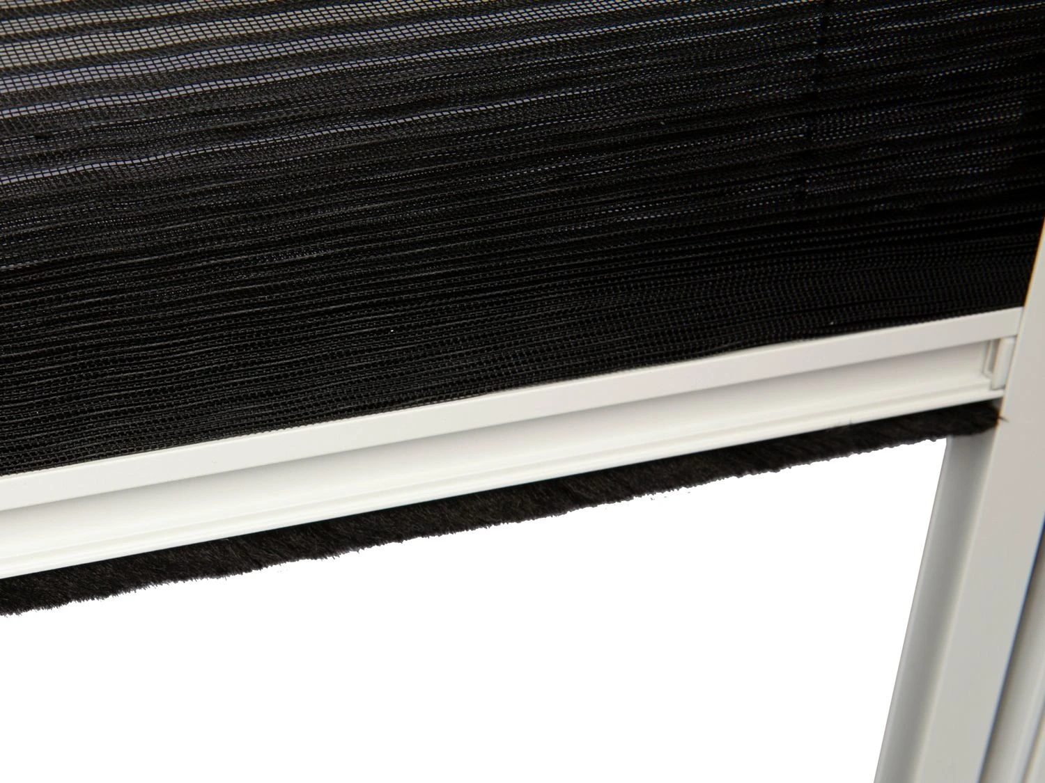 Das Insektenschutz Plisseefenster besteht aus einem stabilen Aluminium-Rahmensystem und einem mobilen Fliegengittergewebe, das sich mit einer Griffschiene innerhalb des Rahmens – wie bei einem Rollo – nach oben und unten bewegen lässt. Das wertige Plissee-Gewebe in schwarz hält Insekten zuverlässig draußen, die Faltung verleiht dem Ganzen einen edlen Look. Das Plissee kann zusammengeschoben werden und bleibt somit auch in der insektenfreien Zeit unauffällig montiert.