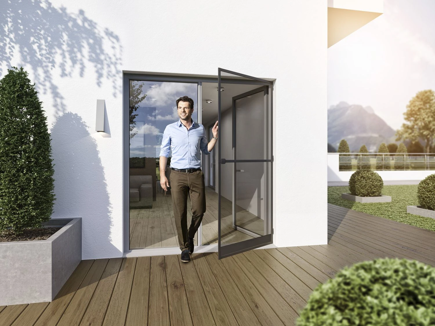 Diese Insektenschutzlösung ist für einen langjährigen Einsatz bestens geeignet. Besonderheiten sind sowohl das Mittelsprossenprofil, das der Insektenschutztüre zusätzlich Festigkeit verleiht als auch die individuell kürzbaren pulverbeschichteten Aluminium-Profile, das reißfeste Fiberglasgewebe und das Trittblech. Lüften, ohne von ungebetenen Insekten gestört zu werden.