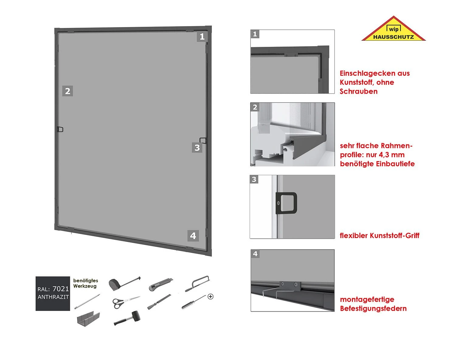Das Großartige an diesem Insektenschutzrahmen ist die flache Einbautiefe von nur 4,3 mm. Dies ermöglicht eine Anbringung auch bei eng anliegenden Rollläden. Im Bausatz enthalten sind pulverbeschichtete Aluminium-Profile, ein reißfestes Fiberglasgewebe, Einschlagecken aus Kunststoff und die montagefertigen Befestigungsfedern. Mit diesem Insektenschutz werden Sie für viele Jahre Freude haben.
